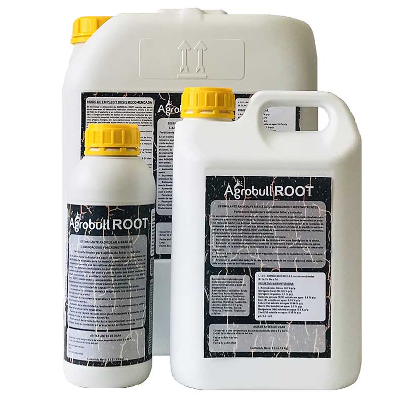 AGROBULL ROOT is a root biostimulant, that is, a growth regulator specifically designed for root improvement and development. It contains: L-amino acids, nitrogen, potassium, phosphorus, vitamins and a suitable balance between macro and micronutrients that allow rapid assimilation and development of the roots which increases their uptake in nutrients contained in the soil.