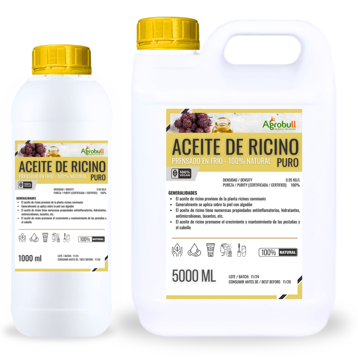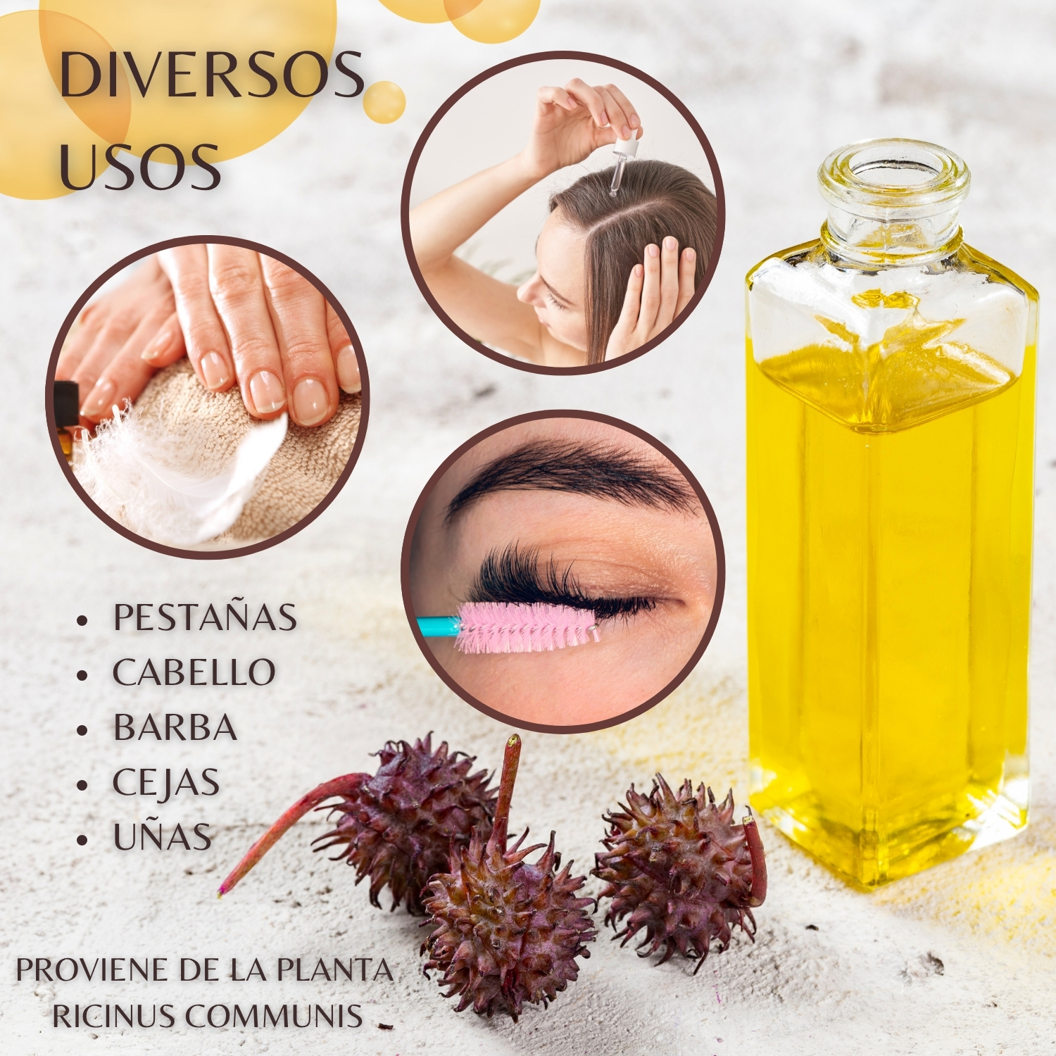 El aceite de ricino es prensado en frío procedente de agricultura ecológica y sin la adición de conservantes. Debido a que es 100 % puro, se absorbe fácilmente en las pestañas y las cejas para estimular el crecimiento del cabello. El aceite de ricino también es un ingrediente clave en el champú anticaspa, los sueros para el crecimiento del cabello y también se puede usar como aceite para las uñas. Además del crecimiento del cabello, el aceite de ricino también es excelente como humectante natural y para la salud de la piel.