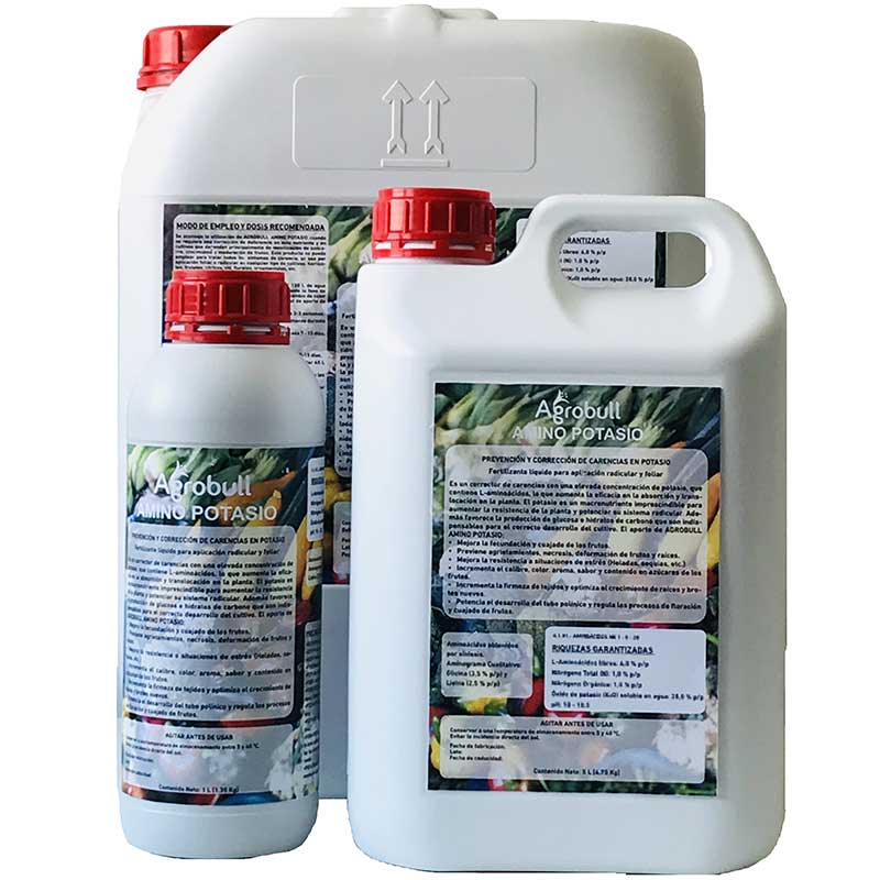 Se aconseja la utilización de AGROBULL AMINO POTASIO cuando se requiera una corrección de deficiencia en este nutriente y en cultivos que dependan principalmente de movilización de azúcares, crecimiento y maduración de frutos. Este producto se puede emplear para tratar todos los síntomas de carencia, ya sea por aplicación foliar o radicular en cualquier tipo de cultivos: hortícolas, frutales, cítricos, vid, florales, ornamentales, etc.
