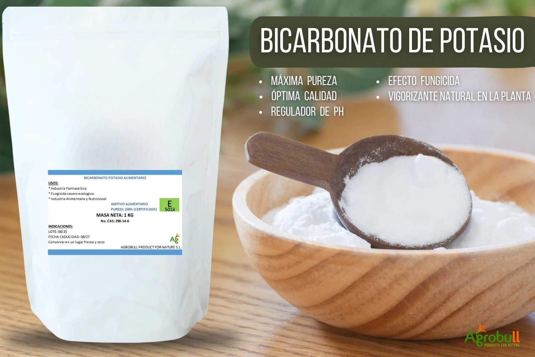 • Mejora la calidad de los cultivos – Además de la protección contra los hongos, el potasio presente en el bicarbonato ayuda a mejorar la dulzura, la conservación y el color de las frutas, contribuyendo al crecimiento saludable de las plantas y a la producción de hortalizas y frutas más sabrosas y nutritivas
